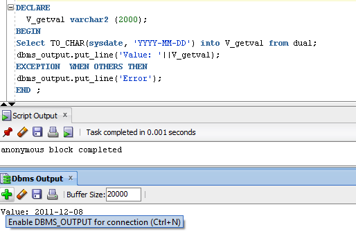 To see the output of script, we need to enable DBMS_OUTPUT by clicking on plus symbol (see below in the snapshot) then we can see the output of script.