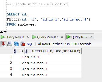 DECODE(value, search_value, result, default_value) compares value with search_value. If the values are equal, DECODE() returns result, otherwise default_value is returned. DECODE() allows you to perform if-then-else logic in SQL without having to use PL/SQL.