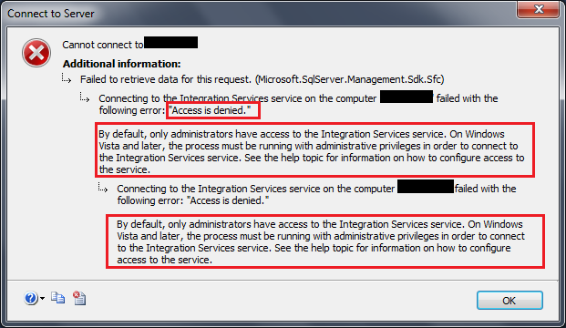 If you are facing the access denied error while connecting to Integration Services as shown below :
