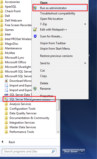 Connect the SQL Server Management Studio with “Run as administrator” option.
