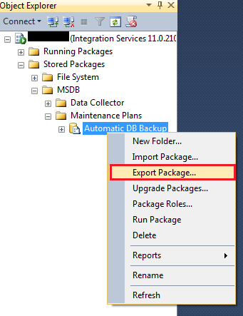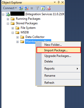 Now simply connect the SQL Server – Integration Service to another machine where you want to migrate/transfer maintenance plan. Navigate to Stored Packages >> MSDB >> Maintenance Plans >> Right click on you Maintenance Plan and go the Import package Option.