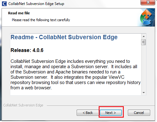 - Execute the Setup file “CollabNetSubversionEdge-4.0.6_setup-x86_64.exe”