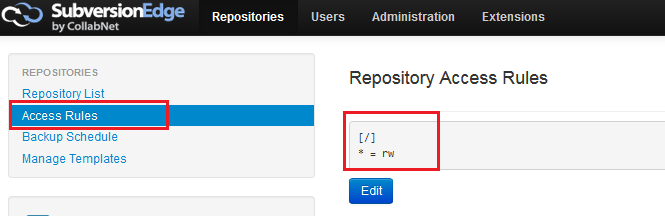 After your installation of CollabNet Subversion Edge, once you will create user that gets the Read-Write Access to all the available repositories because by default Repository Access Rule is (as shown below)