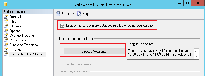 - Login to primary server then navigate to database Properties. Then select the Transaction Log Shipping Page. Check the “Enable this as primary database in a log shipping configuration” check box as shown in given snapshot :