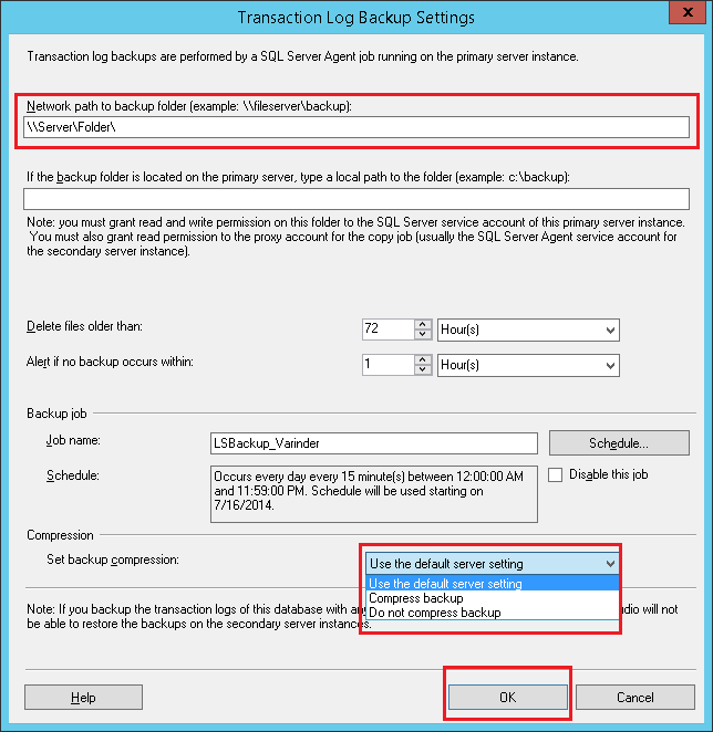 - In the next step, we will configure the Backup Setting as shown in given snapshot. Here will mention network path. Also we can mention local folder path if backup folder path is located on the primary server. Once we are completed with this step, backup jobs will be created on primary server.