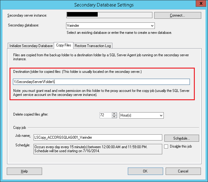 - In the “Copy File” Tab, We will mention Destination Shared Folder where the Log Shipping Copy job will copy the Transactional-Log backup files. Once we are completed with this step, copy jobs will be created on Secondary server.