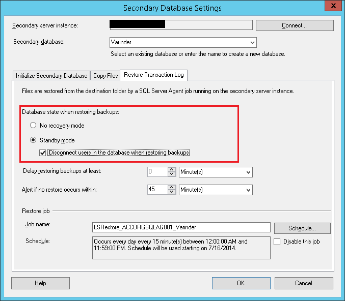- In the “Restore Transaction Log” tab, we will mention database restore state and restore schedule. Once we are completed with this step, restore jobs will be created on secondary server.