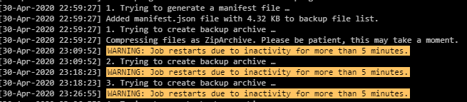 WordPress Backup- WARNING: Job restarts due to inactivity for more than 5 minutes